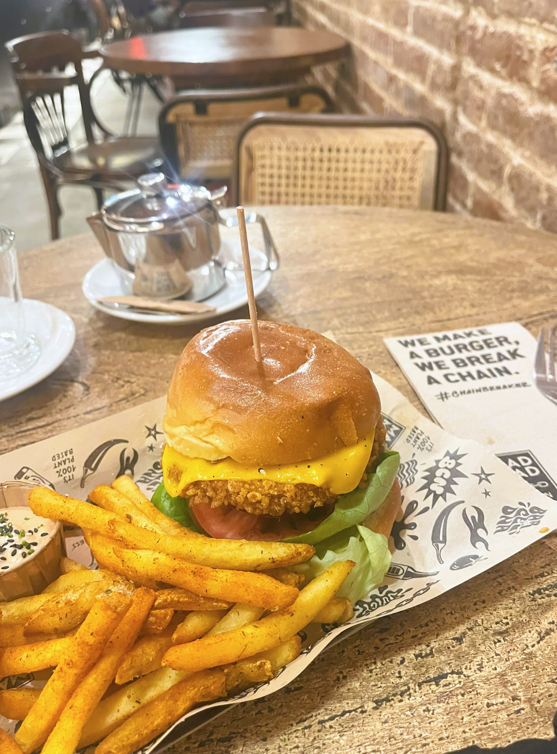 MMV was on the top of my list and I went here instead of VJFB (Vegan Junk Food Bar, a previous favourite closed down). It’s is a lively bar on a Friday night. Perfect weekend night out food menu, with a selection of American style burgers. I had the Rock n’ Chickn + Cajun fries (12.65 EUR). No complaints. 5/5